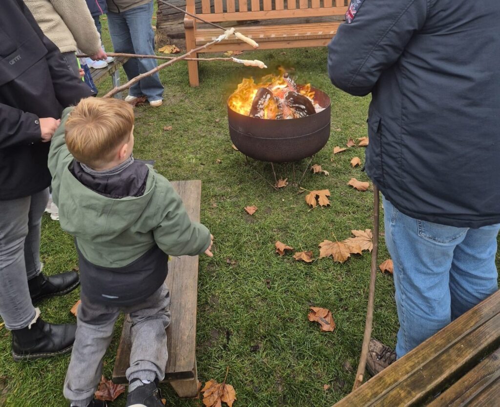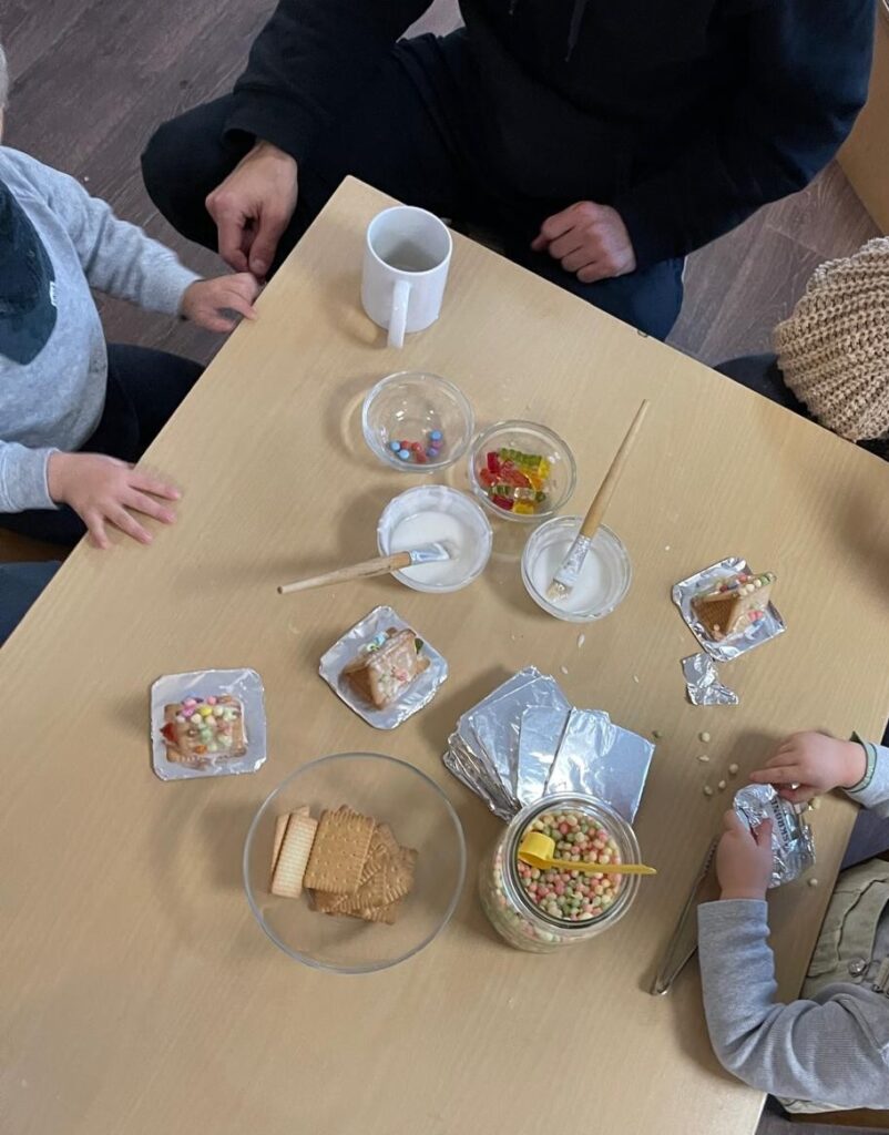 Im Anschluss hatten die Kinder die Möglichkeit, gemeinsam mit ihren Familien an verschiedenen Stationen kreativ zu werden. Es wurde Baumschmuck gebastelt, Butterkekshäuschen gestaltet und dabei warme Getränke genossen. Außerdem konnten Kekse gegessen und in gemütlicher Runde schöne Gespräche geführt werden. Ein weiteres Highlight war das gemeinsame Lagerfeuer, an dem leckeres Stockbrot zubereitet wurde.
