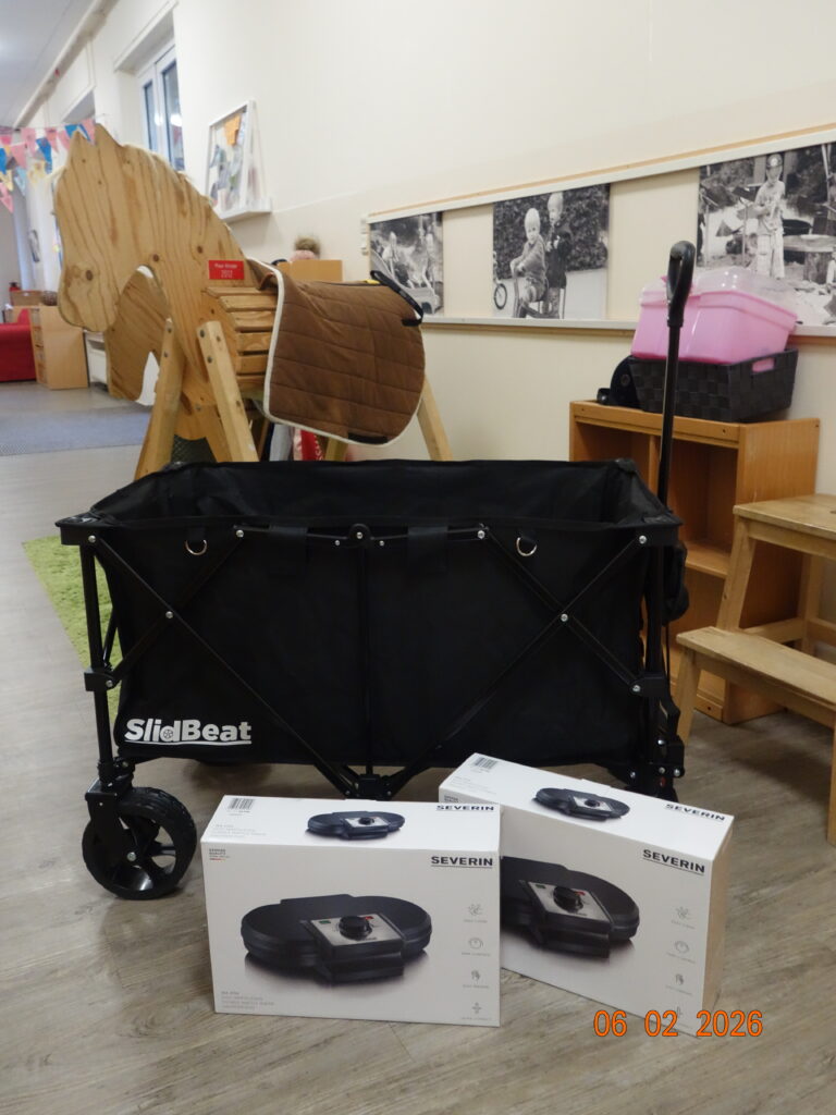 Wir bedanken uns herzlich beim Förderverein, der uns neue Anschaffungen ermöglicht hat. Unter anderem wurden zwei Waffeleisen, ein Bollerwagen und ein Turtlebus gekauft. Zusätzlich gilt ein großer Dank der Volksbank Seppenrade, die den Kauf des Turtlebusses mit 800€ bezuschusst hat, sowie einem anonymen Spender, der uns 500€ zur Mitfinanzierung zur Verfügung gestellt hat. Nun können auch die jüngsten Kinder des Kindergartens mit uns ausgiebige Spaziergänge zu Spielplätzen und weiteren schönen Orten des Dorfes unternehmen!