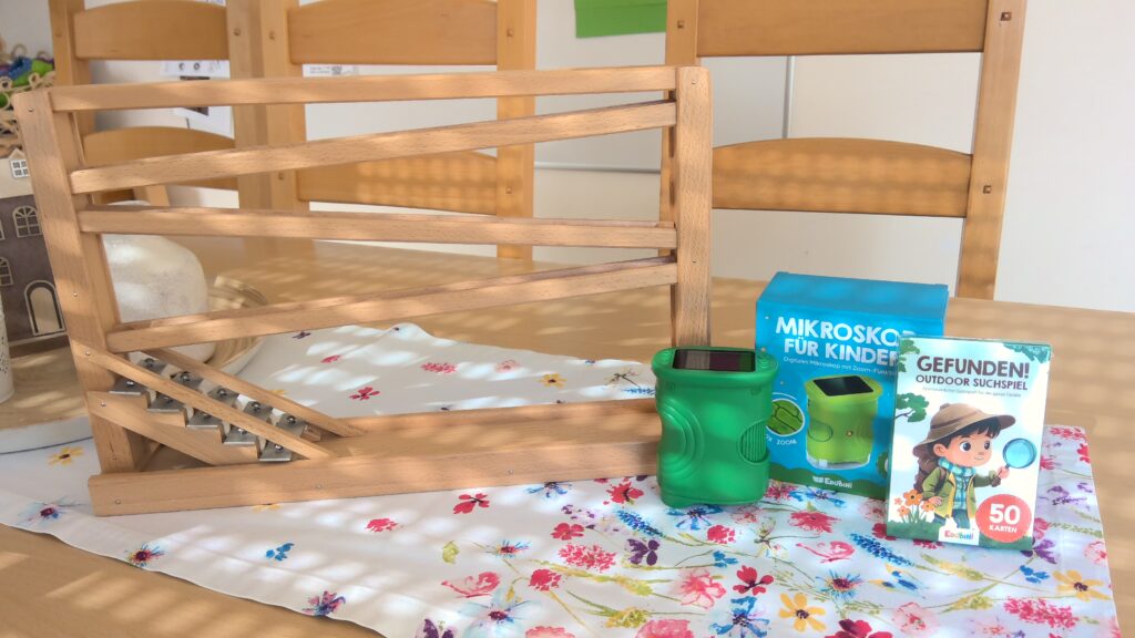 Dank des gewonnenen Förderpennys konnten wir bereits eine neue Murmelbahn und zwei Edubini-Lupengeräte kaufen. Demnächst werden außerdem von dem Geld 20 Outdoor-Geschirrsets gekauft, die ein warmes Mittagessen während der Waldwochen ermöglichen und unsere sensomotorischen Spielmaterialien werden weiter aufgefüllt.
